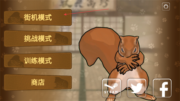 1. 模式选择界面,点击街机模式按钮,进入该模式的游戏流程;界面还包含挑战模式、训练模式、商店等功能选项。