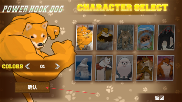2. 角色选择界面,选定角色后,点击确认按钮完成角色选择,进入战斗准备环节;可通过COLORS功能切换角色外观配色。