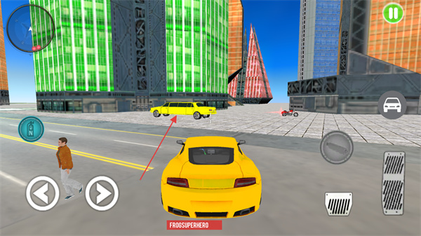 2、切换驾驶黄色跑车,通过方向键和油门在城市道路行驶,快速移动。