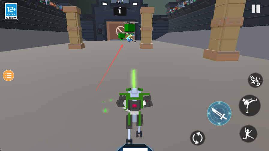 2、到达角斗场后,通过屏幕左侧的虚拟摇杆控制机器人移动方向,确保能观察到周围环境和敌人位置。
