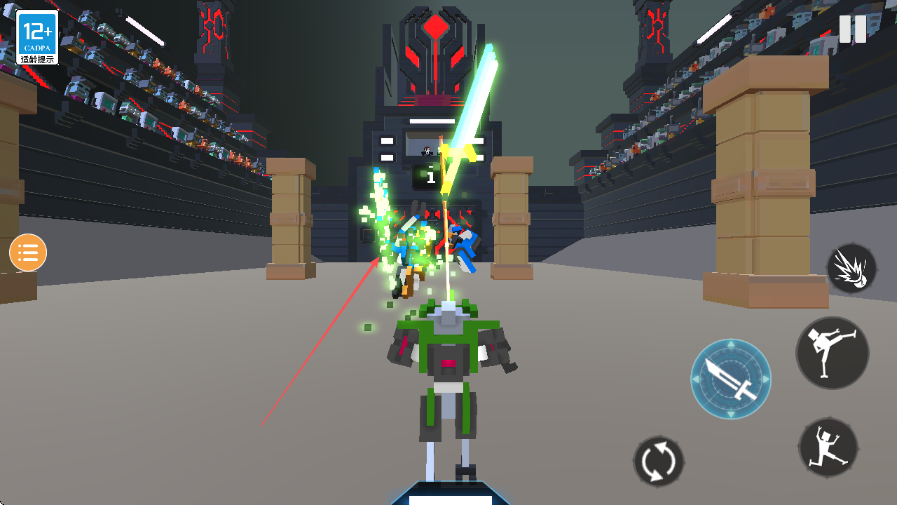 1、基础格斗操作:通过虚拟摇杆控制机器人在角斗场移动,点击攻击按钮释放武器技能近战武器需贴近对手,远程武器需瞄准,长按闪避按钮躲避敌方攻击。