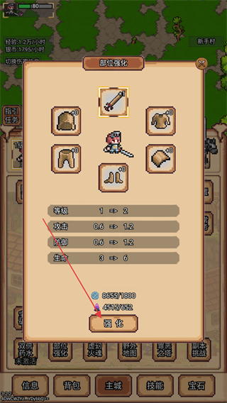 1、点击主页的部位强化,可以查看角色的当前属性值,点击强化按钮消耗金钱和宝石进行强化。
