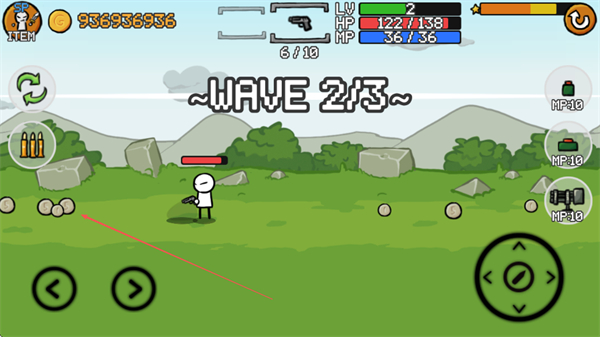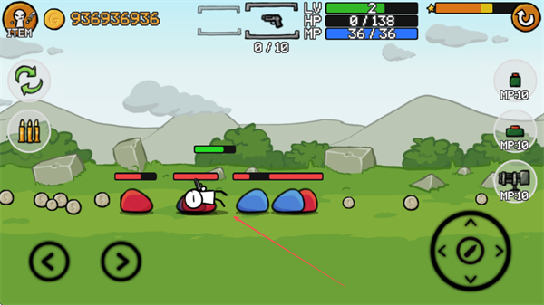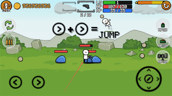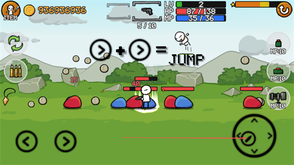 1、操控火柴人移动,双击右方向键可跳跃,攻击蓝色敌人,收集道具和金币。
