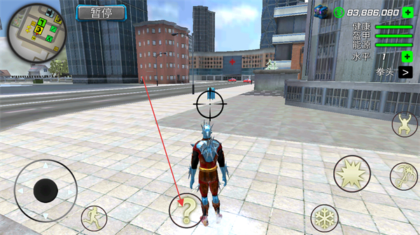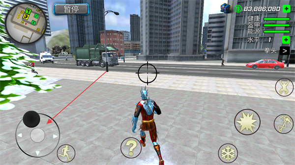 1、操控英雄在城市移动,通过左侧虚拟摇杆控制方向,观察地图与场景元素。