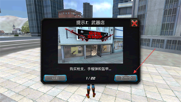 3、点击下一个关闭提示,前往GUNSHOP武器店,准备购买装备。