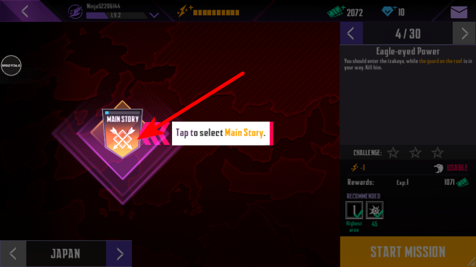 2、进入任务选择界面,点击MAIN STORY选项选定主线任务,查看任务描述了解目标要求,为任务执行做准备。