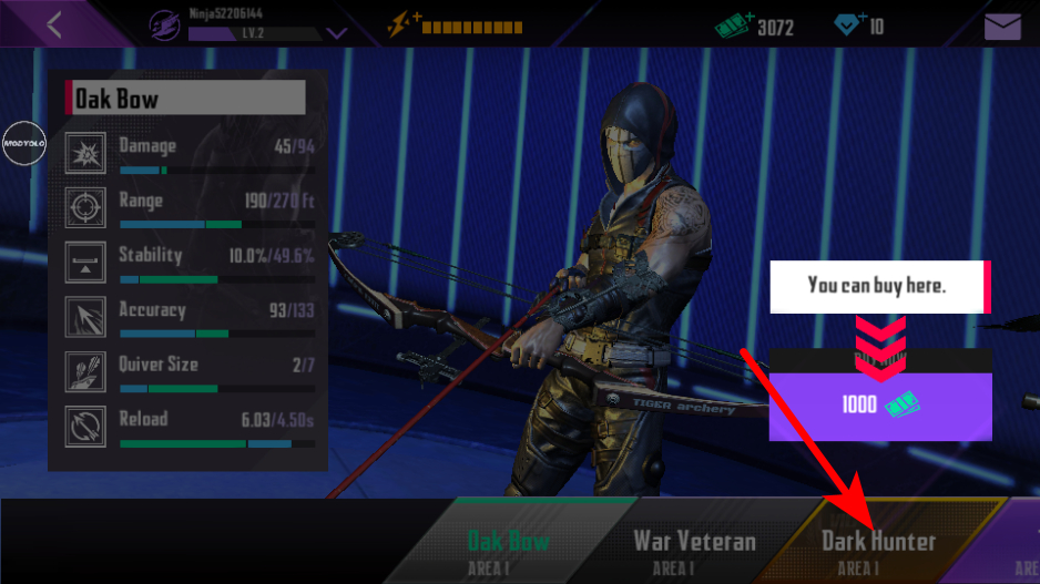 1、在武器库界面,查看不同弓箭的属性,消耗资源解锁更强力的弓箭,提升后续射击任务的输出效率。