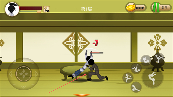 1、操控角色攻击敌人,造成伤害如-7,利用左侧摇杆移动走位。