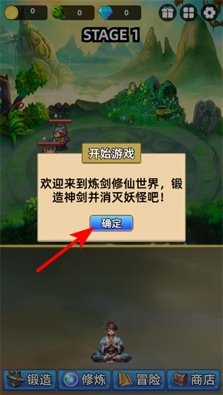 1、进入炼剑修仙游戏界面后,点击红色箭头指向的确定按钮,关闭欢迎提示弹窗,正式进入游戏的修仙场景。