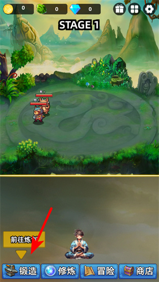 4、在炼剑界面中,点击红色箭头指向的锻造按钮,消耗初始资源打造铜剑,获取第一把武器,提升角色的攻击力属性。