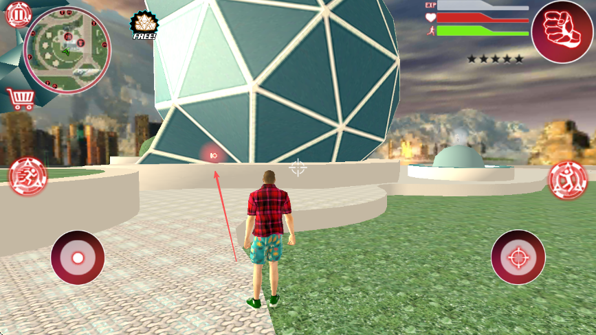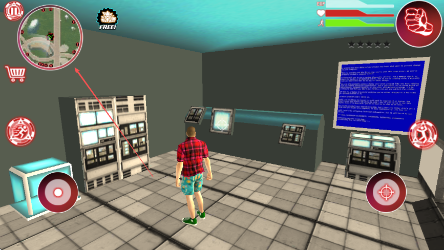 1、进入游戏界面,左上角小地图可查看位置和路线,红色购物车图标是商店。