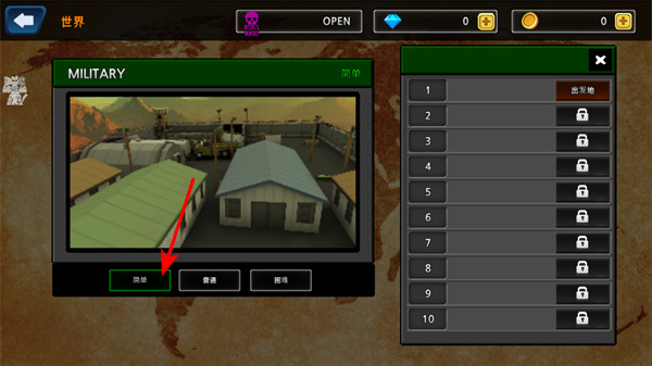 1、游戏中点击开始按钮,可进入军事主题的射击场景,这是开启游戏的关键操作,点击将参与僵尸射击挑战。