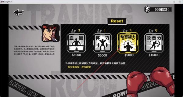 4、进入训练界面,花费游戏货币,升级如动态视力等属性,增强角色战斗能力。