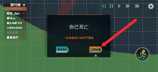 4、若对局中角色被击败,点击立即结算按钮统计本局战绩,这是总结对局的操作,结算后可查看本局击杀数等数据,为下局调整移动、收集策略做参考。