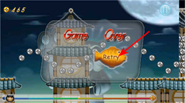 3、若闯关失败出现Game Over提示,点击Retry按钮重新开始关卡挑战,借助之前的操作经验调整移动节奏,避开更多障碍提升表现。