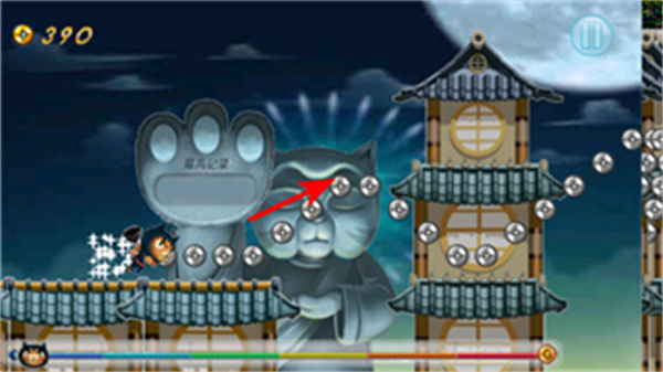 2、进入关卡后,操控忍者猫移动,躲避场景中出现的飞镖类障碍,同时留意界面的最高分记录,尝试通过灵活移动突破分数上限。