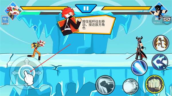 2、进入战斗后按照提示按住摇杆往右移动接近敌方角色,操作摇杆控制角色移动,向敌方角色靠近为后续战斗做准备。
