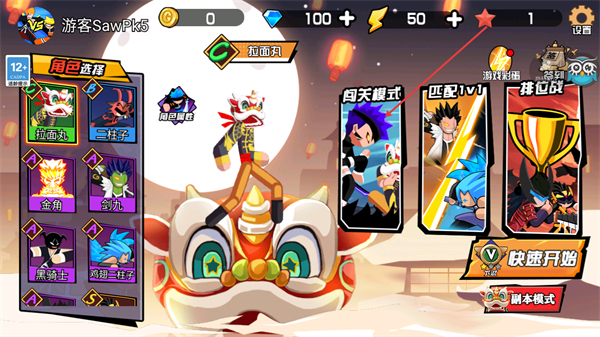 1、在该界面进行角色选择,可选中拉面丸等角色后,选择闯关模式或匹配1v1等玩法,再点击快速开始进入游戏。