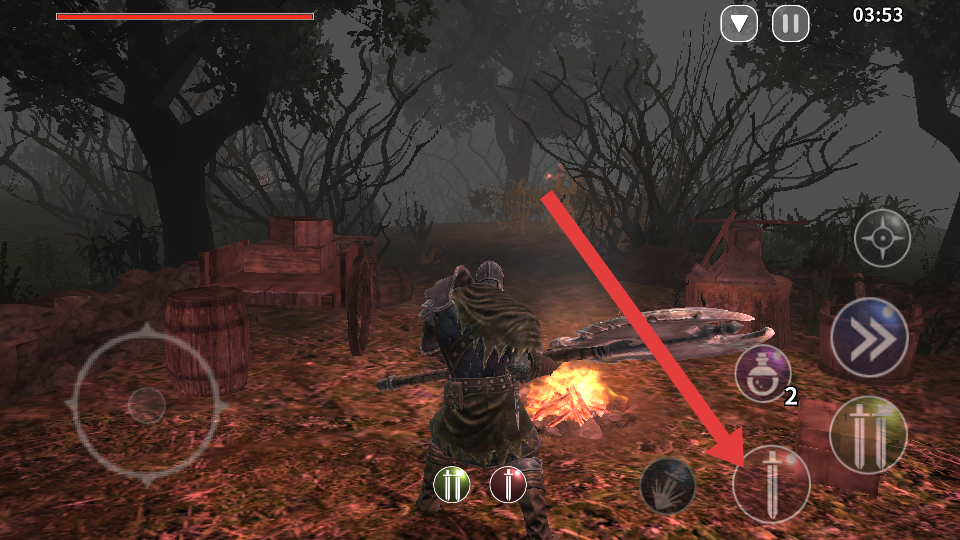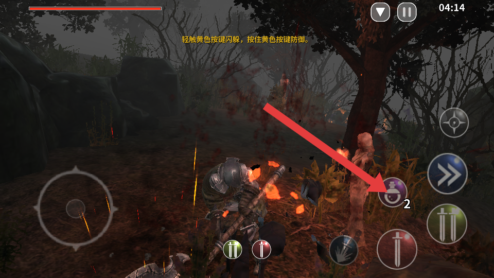 1、在场景中,点击箭头指向的武器攻击按钮,操控角色挥动武器,对周围环境或敌人发起攻击,开启战斗流程。