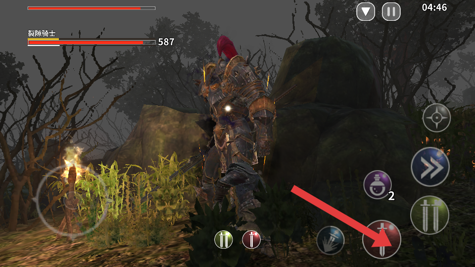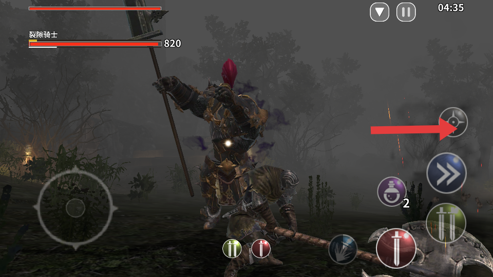 3、面对强敌裂隙骑士,点击箭头指向的瞄准按钮,锁定敌人,便于更精准地发动攻击,提高命中效率。