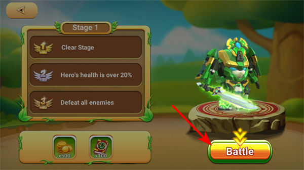 2、点击Battle按钮进入战斗场景,这是推进关卡的基础操作,进入后可操控机甲角色参与战斗,向关卡目标推进。