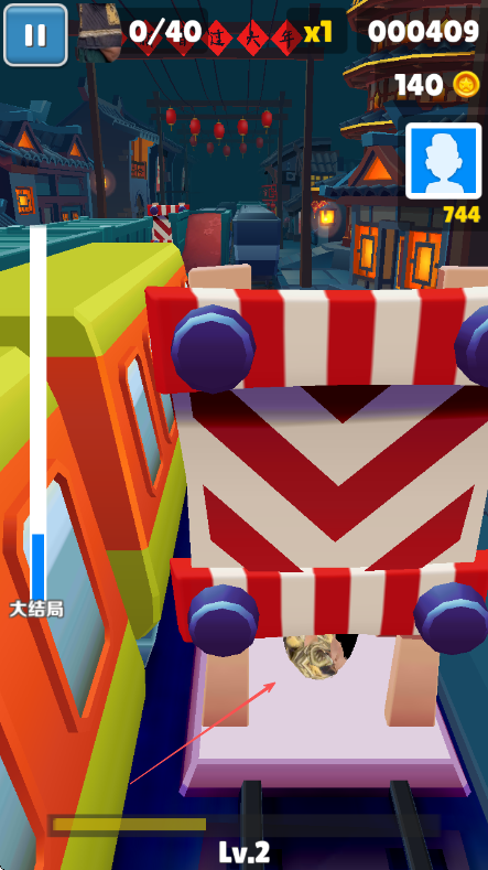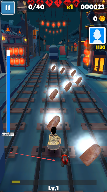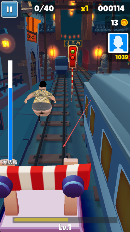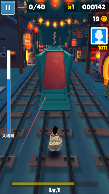 4、看到前方的障碍物,像红白栏杆、轨道上的列车等,及时滑动屏幕躲避,持续奔跑到达终点。