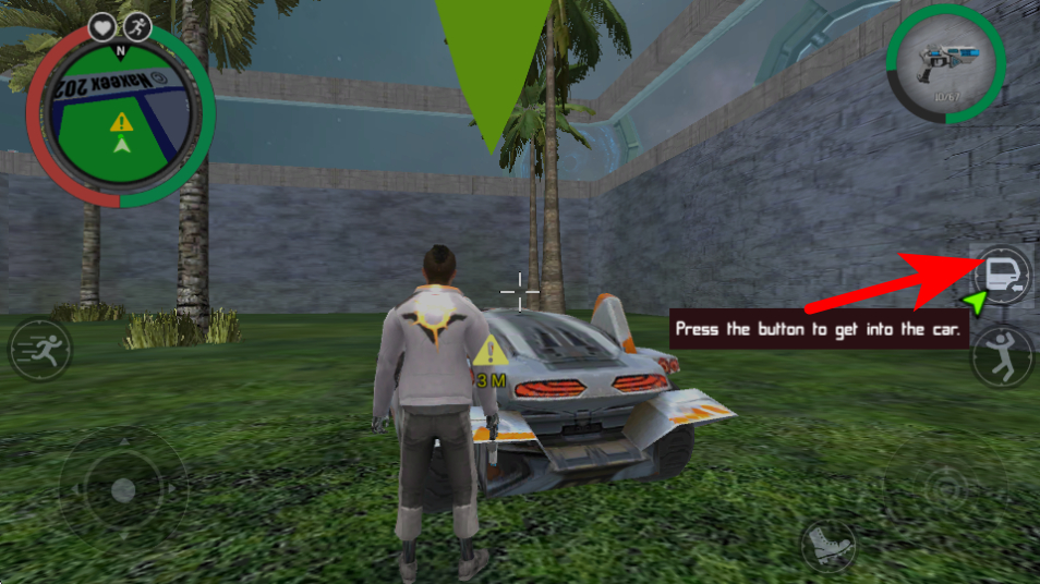 1、靠近载具后,点击红色箭头指向的载具按钮,进入汽车内部,这是驾驶载具的关键操作,准确点击才能切换到驾驶视角继续推进关卡。