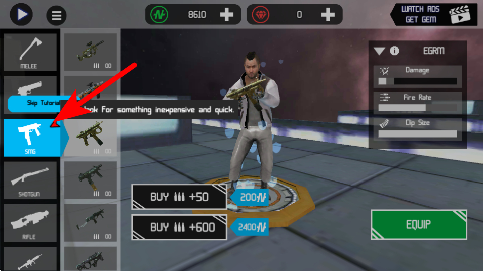 4、打开装备界面后,点击红色箭头指向的SMG武器选项,选中该武器,这是更换战斗装备的基础步骤,为后续战斗做好装备准备。