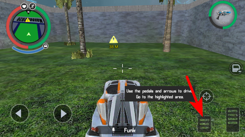 2、进入驾驶视角后,操作红色箭头指向的驾驶控制按钮,结合踏板与方向键操控汽车,朝着高亮区域移动,跟随提示的路线调整行驶方向。