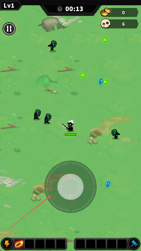 1、进入游戏,通过屏幕下方的虚拟摇杆操控火柴人英雄移动,躲避敌人靠近。