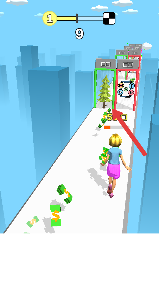 1、在城市风格的跑道上,遇到箭头指向的带有图案的门时,操控角色进入该门,可触发特殊效果,获取道具或改变跑道场景。