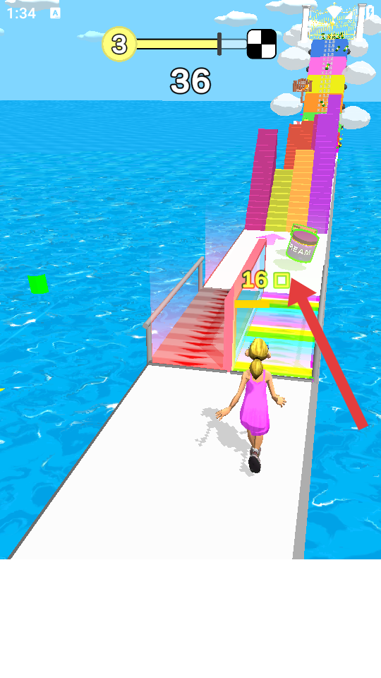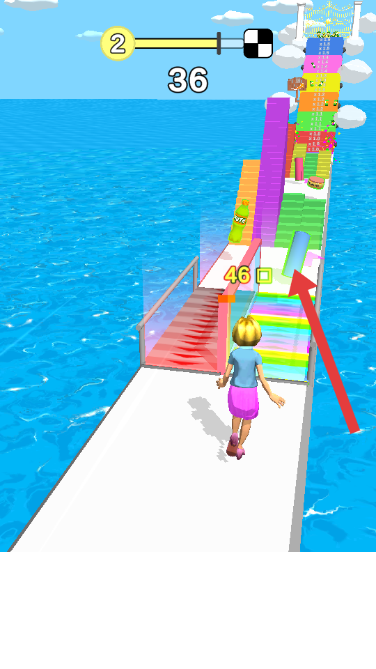 2、来到水上跑道,看到箭头指向的彩色通道时,引导角色进入,能获得加速或其他增益,快速通过这段跑道,提升闯关效率。
