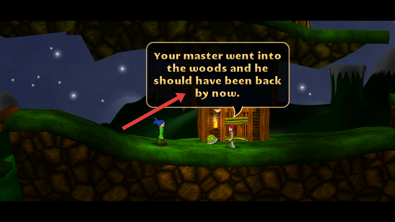 2、与NPC对话得知师父进入森林未归的消息,这是触发主线任务的关键剧情,推动角色继续前往森林来寻找师父。
