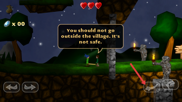 3、尽管村民警告村庄外不安全,仍需操控角色使用攻击按钮,准备应对野外的危险,为探索森林做好战斗准备。