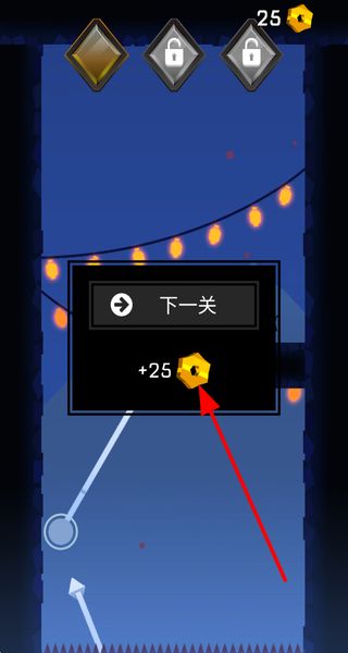 4、忍者成功抵达塔楼顶部完成关卡,获取金币的奖励,点击下一关按钮进入后续挑战。