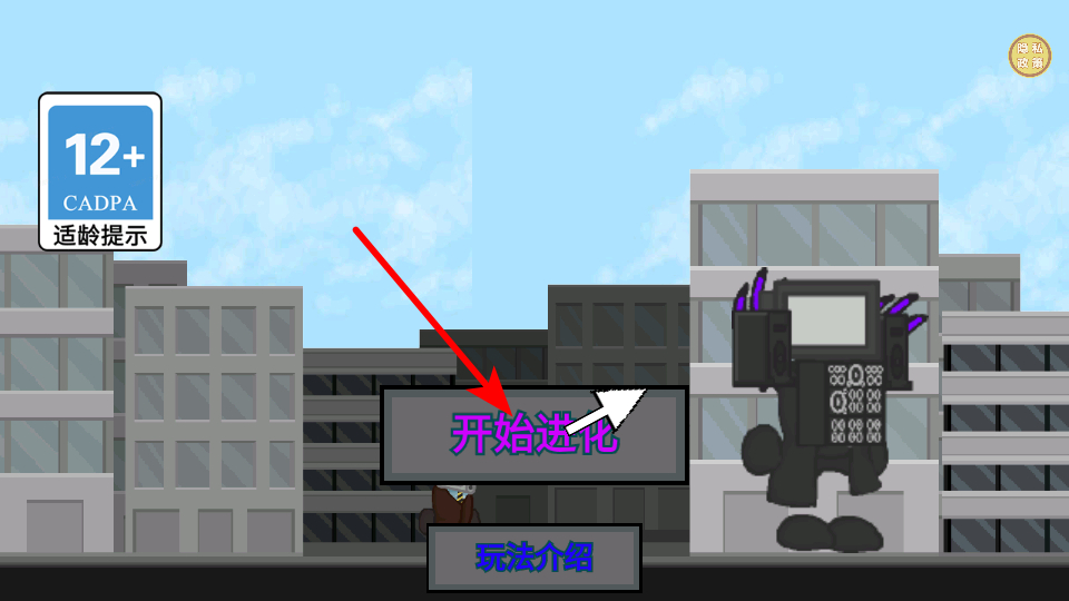 2、找到箭头标注的按钮,点击它开启进化流程,这是进入游戏主玩法的基础操作,点击后即可开始监控人的成长。
