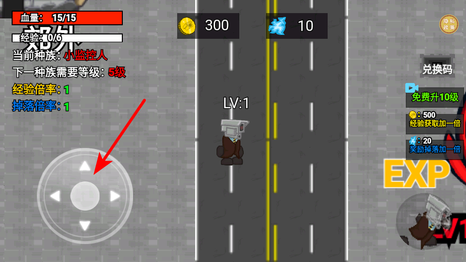 3、操作箭头指向的摇杆,这是控制监控人移动的核心操作,拖动后可让角色向目标区域行进以获取经验和资源。