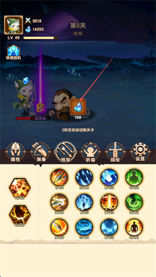 3、击败BOSS后,可获得钻石等奖励,同时自动切换到技能界面,可升级攻击、防御等技能,提升角色战力。