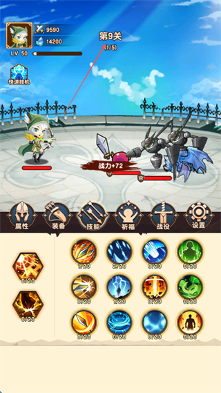 4、进入后续关卡如第9关,挑战新的敌方怪物如机械骑士,依靠升级后的技能和战力,自动进行战斗,逐步推进关卡。
