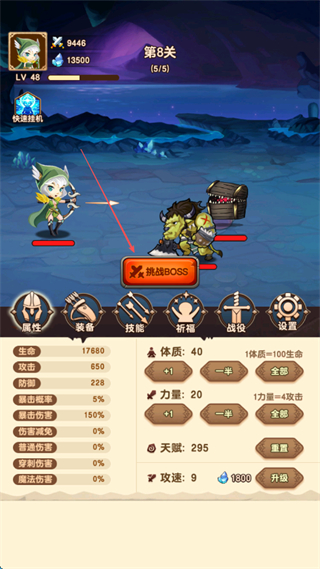 1、在关卡中挑战BOSS如第8关的兽人怪物,点击挑战BOSS按钮发起战斗,利用角色自动攻击机制消耗BOSS血量。