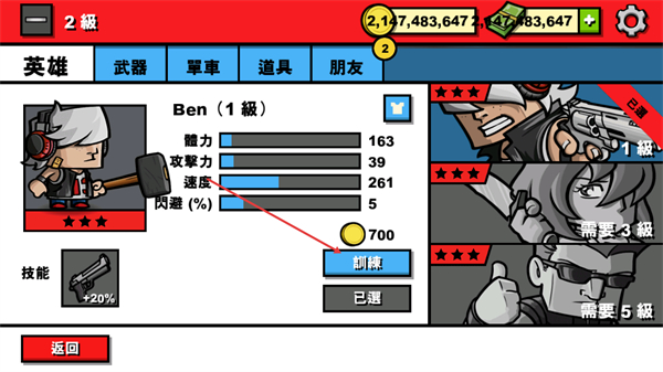 3、在装备界面查看英雄Ben的属性,消耗对应资源点击训练按钮,提升其战力属性以增强任务作战能力。