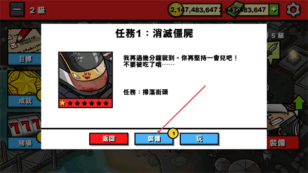 2、查看任务1扫荡僵尸的扫荡街头目标,点击装备按钮配置道具后,即可进入任务环节。