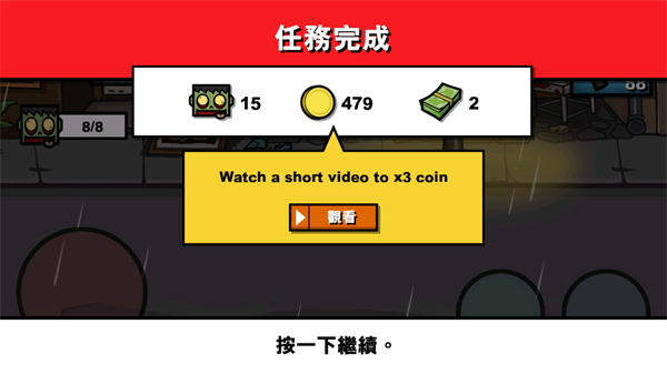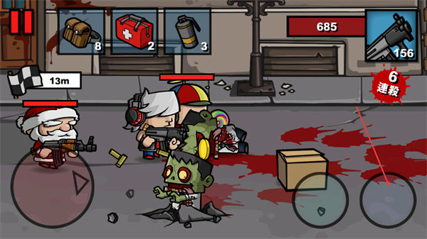 4、在战斗场景中点击右下角按钮击败僵尸积累连杀次数,同时利用上方道具栏物品辅助战斗,向终点方向推进完成任务。