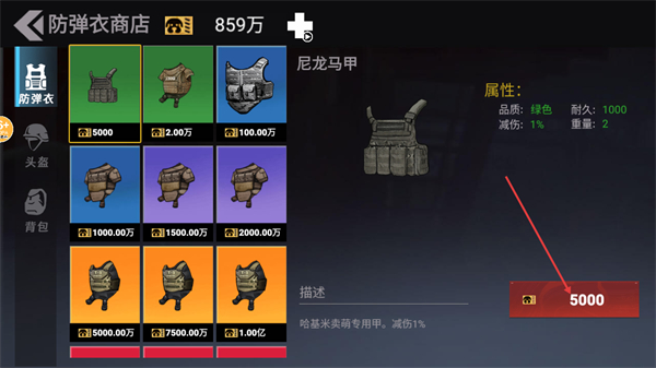 2、进入防具商店后,可查看不同防具如尼龙马甲,其属性含减伤1%等,选择对应防具消耗资源即可购买,按需挑选适配的装备提升自身能力。