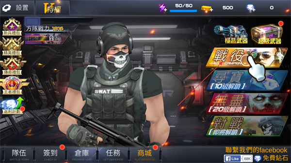 1、打开雷霆枪战游戏主页,点击右侧战役按钮进入游戏。
