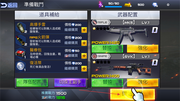 2、战斗准备界面可以选择购买道具补给,或是选择强化武器,完成所有准备工作后点击下方开始战斗按键进入战斗。