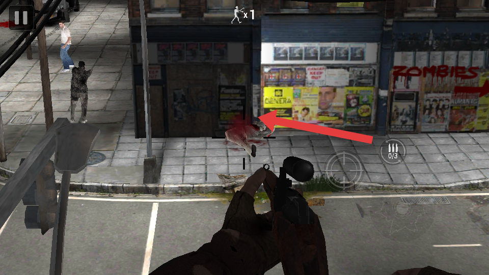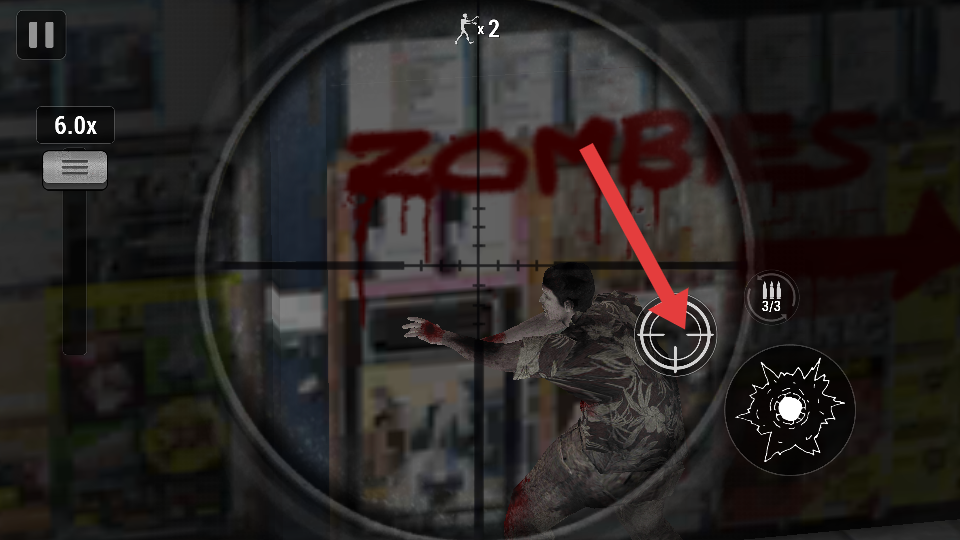 3、使用瞄准镜时,将准星对准箭头指向的丧尸,精准射击,提升击杀效率,减少弹药消耗。