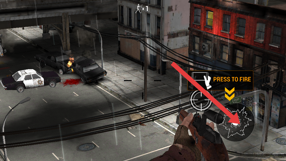 1、在城市街道场景中,瞄准箭头指向的目标区域,点击PRESS TO FIRE射击按键,向目标开火,对丧尸等敌人造成伤害。