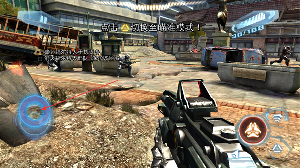 2、点击右下角的箭头标识按钮可以翻越前方的墙面,进入敌方范围圈进行厮杀。