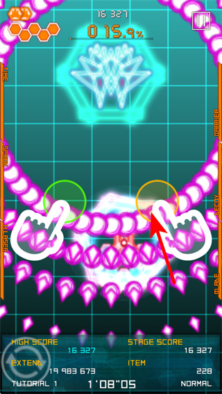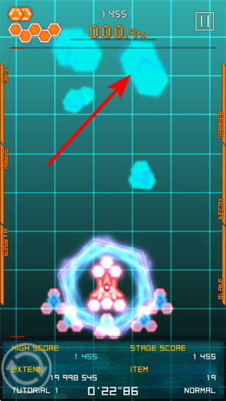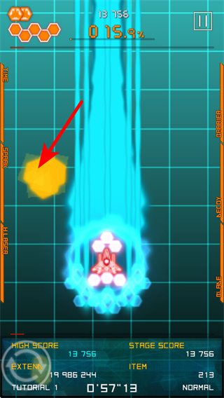 4、遇到密集弹幕时,拖动红色箭头指向的区域,操控战机移动到安全区域,避开弹幕攻击。
